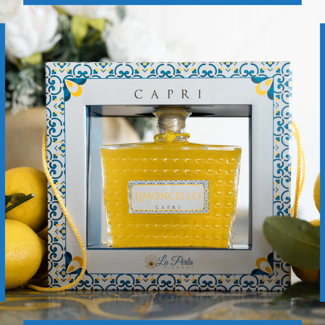 La perla Luxury Capri Limoncello, Liquore a base di limone , ha una tradizione antichissima in Campania Ottenuto dall'infusione di scorze di limoni maturati al caldo sole dell'isola di Capri che conferiscono al prodotto un inebriante profumo. Permettendoci di restituire alla nostra ispirazione divina. L'isola di Capri.